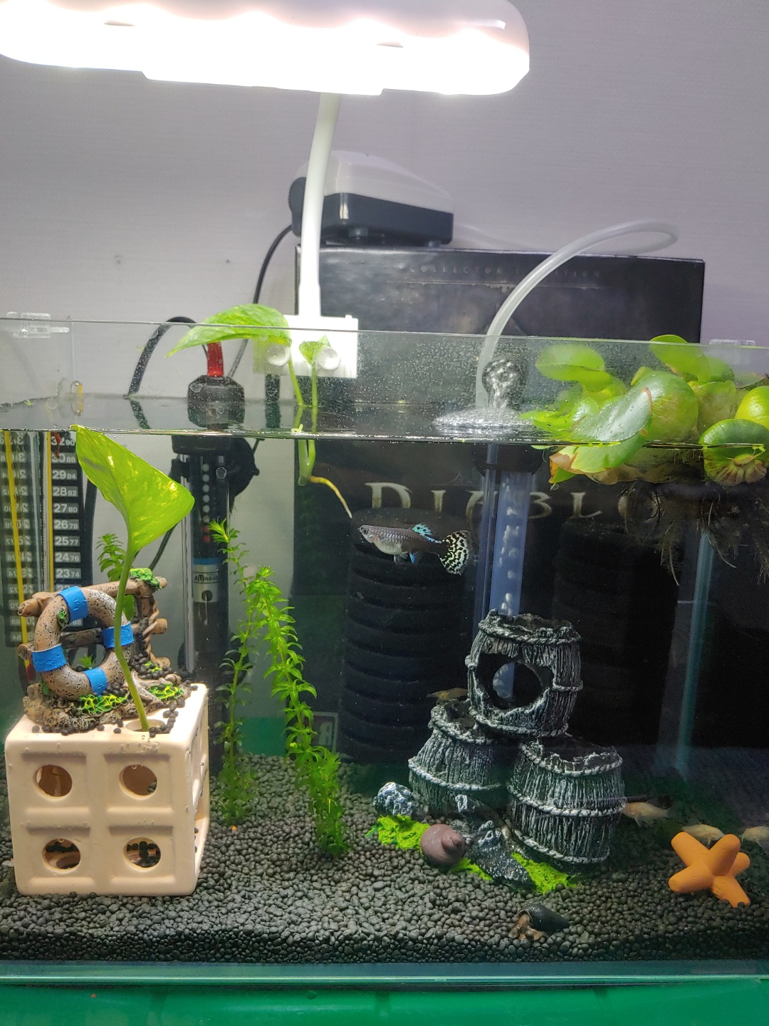 여러 장식을 구매해서 집어 넣었다. 검정말도 열심히 성장 중이다.